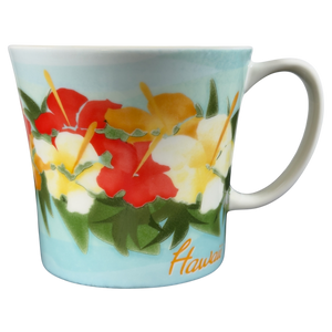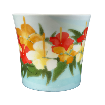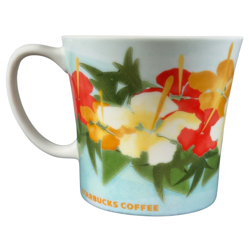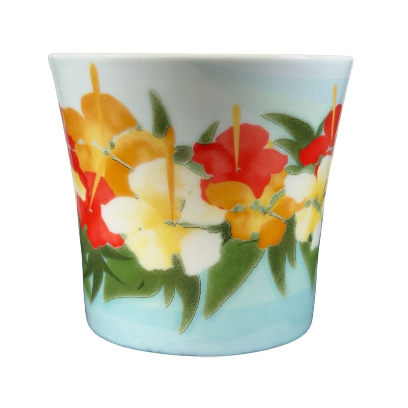 Features beautiful artwork depicting Hibiscus flowers wrapping around its exterior surface.