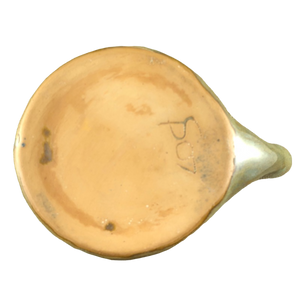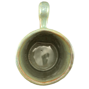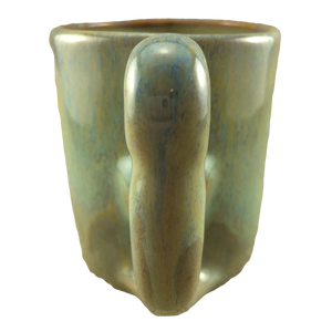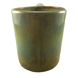 It has a very pretty green, yellow, and brown drip glaze finish on its interior, exterior, and handle.