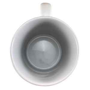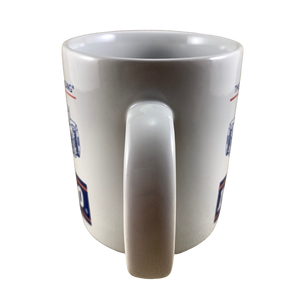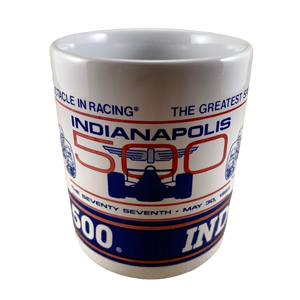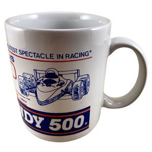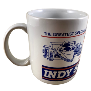 Wrapping around to the rear of this mug is an image of the Indianapolis 500 racetrack.