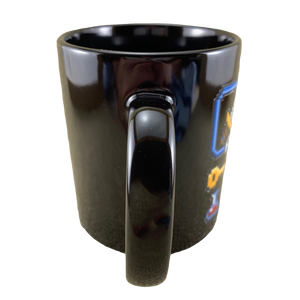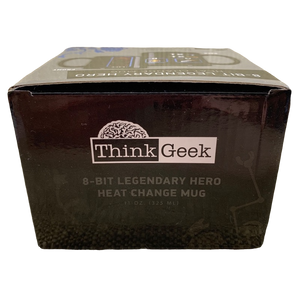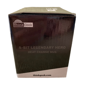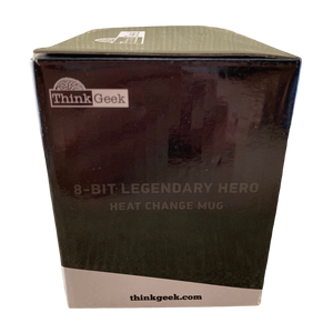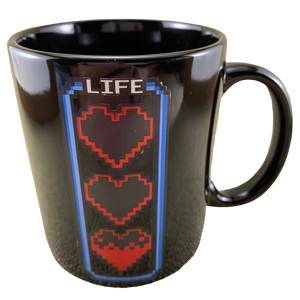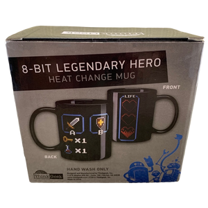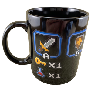 In the olden days, children, many home video game controllers only had two buttons. One was used to attack and one for jumping or defense. And inventory was very simple, too. You might have two or three things, shown at the top of the screen next to your life meter, and that was all. This mug represents one such status area. We call it the 8-Bit Legendary Hero Heat-Change Mug.