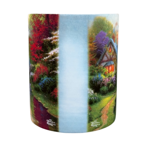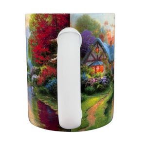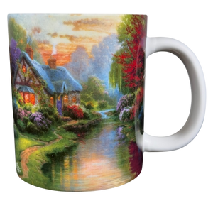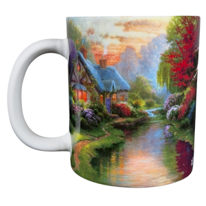 Features the same beautiful image of a cottage next to a stream on its front and rear surface.