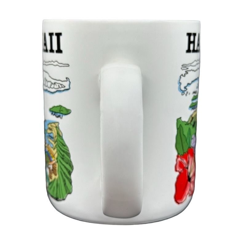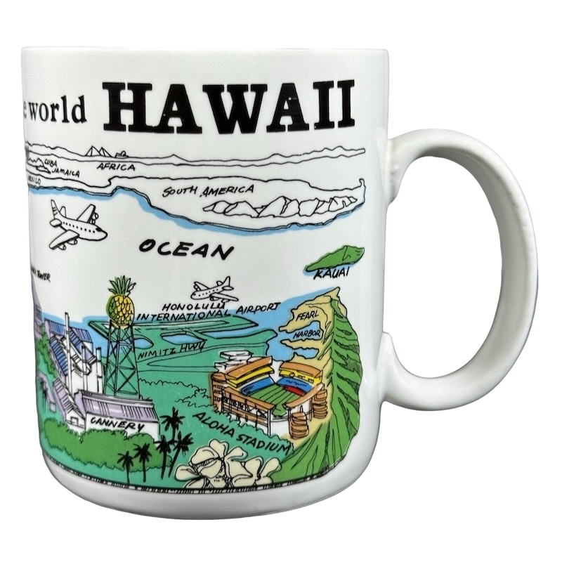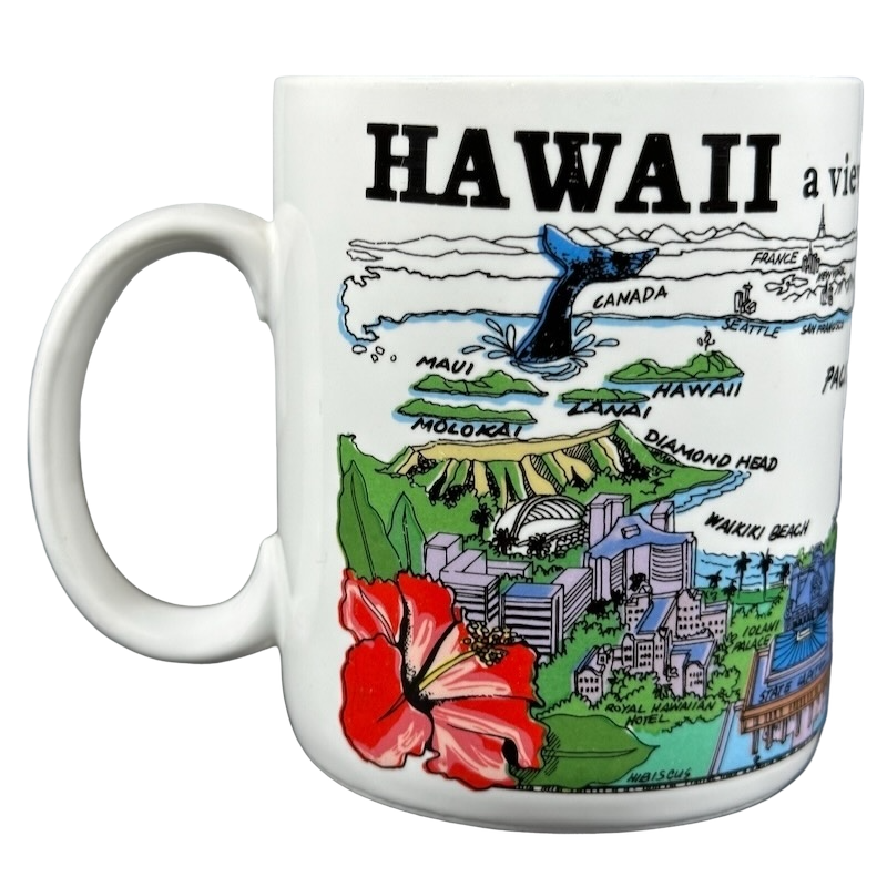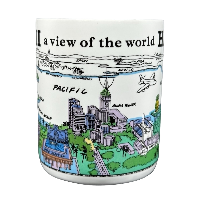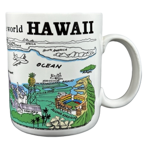 Features an aerial view of Hawaii on its front and rear surface with "HAWAII a view of the world HAWAII" printed above.