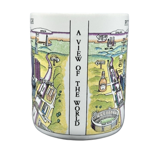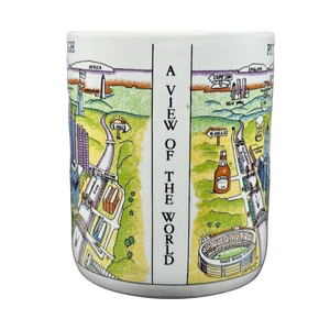 Also has "A VIEW OF THE WORLD" printed vertically on the exterior surface opposite the handle.
