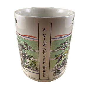 Also has "A VIEW OF THE WORLD" printed vertically on the side opposite the handle.