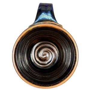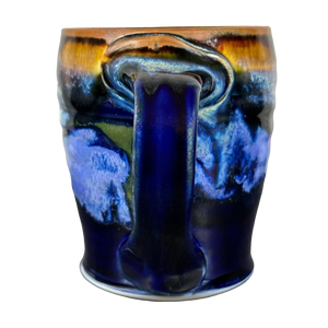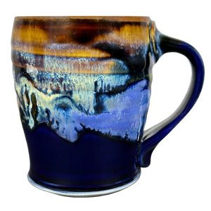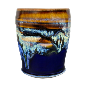 This is a hand thrown drip glaze pottery mug with an abstract finish.
