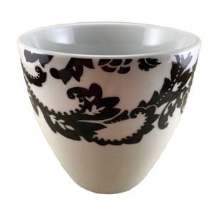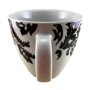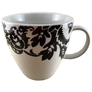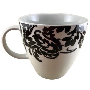 Features an abstract black and white floral pattern encircling the upper half of this mug.