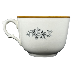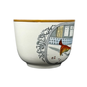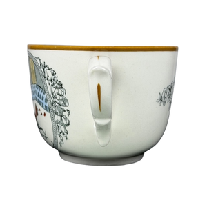 This authentic vintage ceramic mug from the Old English Sports collection by Adams features a captivating hand-colored scene titled Cock Fighting drawn by Henry Alken. The detailed illustration depicts two gamecocks in a traditional arena setting, framed by an ornamental border and classic sporting motifs like horns and trophies. Crafted in England with a rich heritage dating back to 1657, the ivory-toned vessel is finished with a sophisticated ochre rim and a delicate black floral spray on the reverse side. The sturdy oversized handle and wide-brimmed design make this a unique collectible piece for enthusiasts of traditional English pottery and historic sporting art.