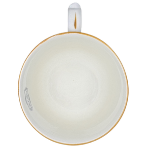 This mug appears unused with its original sticker still on its bottom surface.