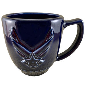 This is a larger and heavier than average mug. It features the US Air Force logo embossed boldly on its front surface.