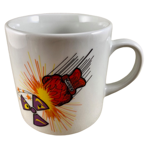 It features the same artwork on its front and rear surface consisting of an image of a boxing glove striking a radiation symbol that has a frightened looking face formed within it.