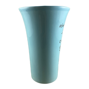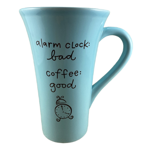 This is a very tall mug with artwork on the front surface that depicts a sketch of an alarm clock with the following printed above it: