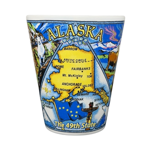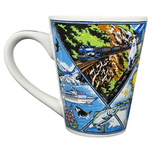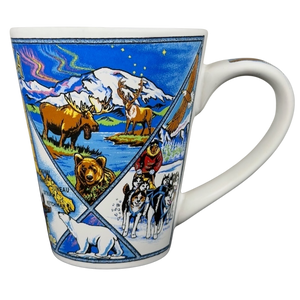 This vibrant souvenir mug celebrates the natural beauty of Alaska with a detailed wrap-around illustration featuring iconic landmarks and wildlife from the 49th State. The design includes a central map of Alaska highlighting major cities like Anchorage and Fairbanks, surrounded by colorful depictions of grizzly bears, moose, bald eagles, and sled dogs set against snow-capped mountains and the northern lights. Functional artistic touches extend to the handle, which features a soaring eagle and Dall sheep, while the interior rim is branded with an Alaska logo. Produced by Arctic Circle Enterprises in Anchorage, this high-quality ceramic mug captures the spirit of the Last Frontier, making it an ideal keepsake for travelers and nature enthusiasts.