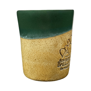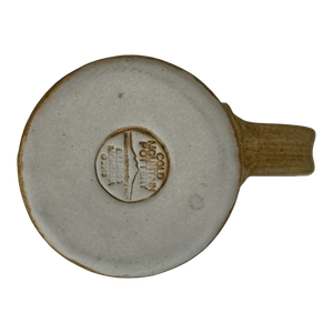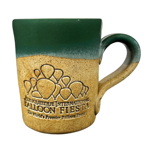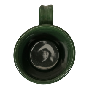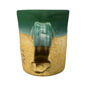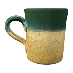 This mug has a two tone design with the majority of it being tan and the upper portion being green. The green portion continues on to the upper part of the handle and the entire interior.