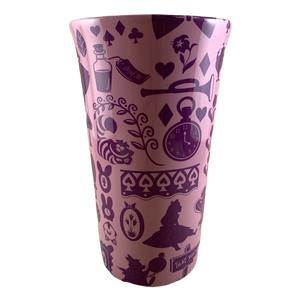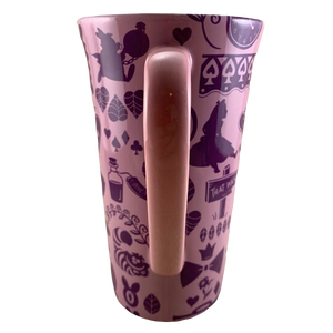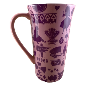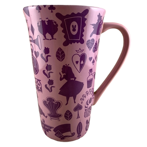 This tall mug features many different images from Alice In Wonderland wrapping around its exterior surface.