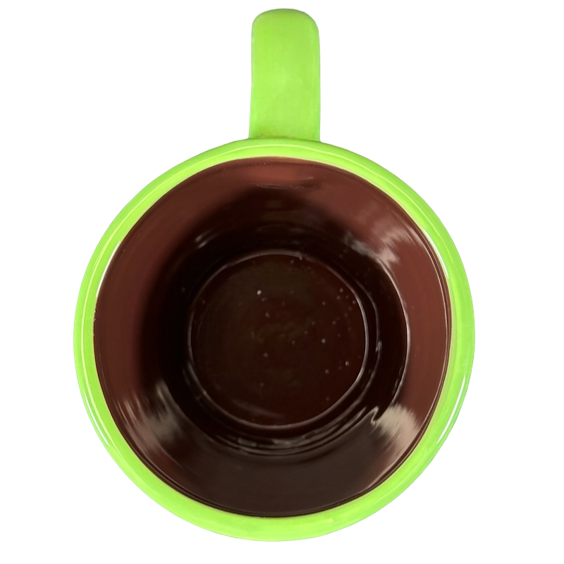 There is a dot on the bottom rim where the green paint was not applied resulting in a white dot. Please see the black arrow pointing to this in the last photo.