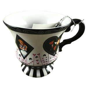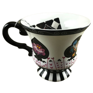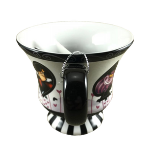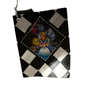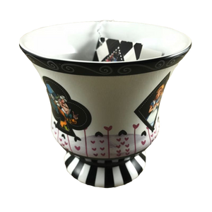 Features artwork wrapping around the exterior surface consisting of images from Alice In Wonderland. Each character is inside a symbol of a different playing card suit.