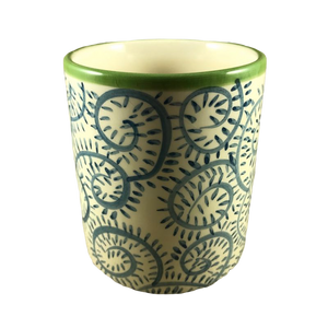 Features a blue, green, and white swirl pattern covering the exterior surface.