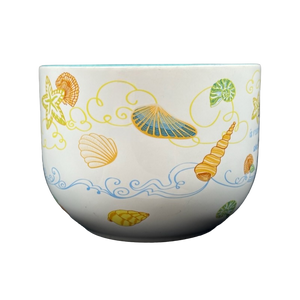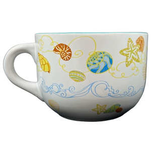 Features artwork depicting sea shells and starfish wrapping around its exterior surface.