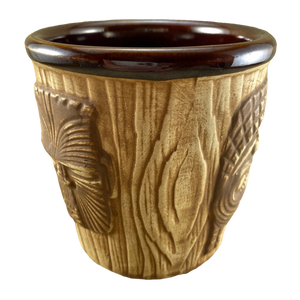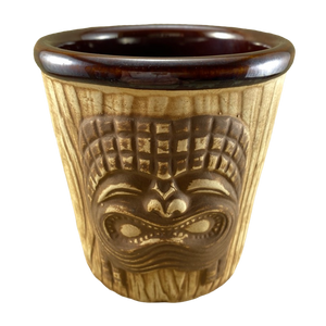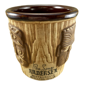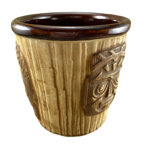 This extremely rare mug features 3 embossed faces on its exterior surface.