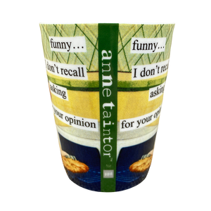 Has "funny...I don't recall asking for your opinion" printed on both the front and rear surfaces to the left of the artwork.
