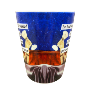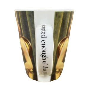 Also has "he wasted enough of her precious time" printed vertically on the handle.