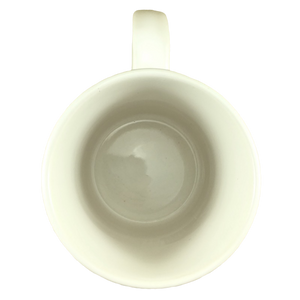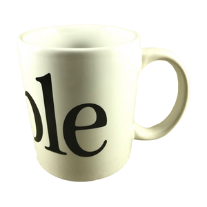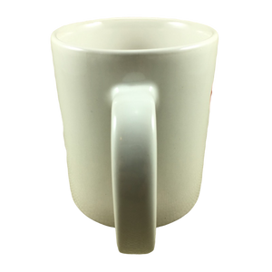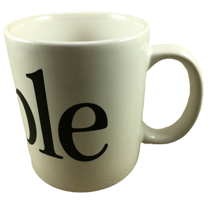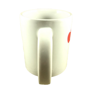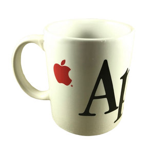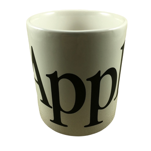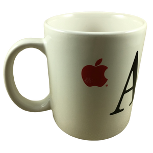 Features "Apple" written in a very large font wrapping around the exterior surface of the mug and a red Apple logo to the left of the A in "Apple."