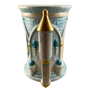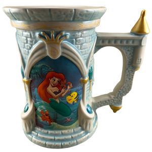 This beautiful and rare mug is shaped like a castle with Ariel on its front surface along with Flounder the fish and Sebastian the lobster.