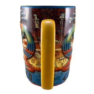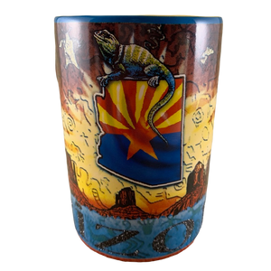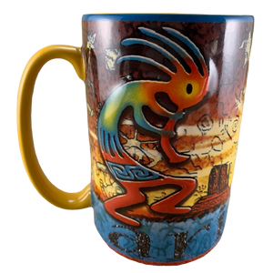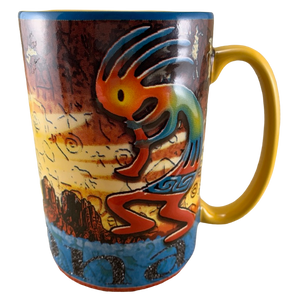 It measures in at just over 5 inches in height and features incredibly colorful artwork wrapping around its exterior surface. This consists of Strongly embossed Kokopelli and Arizona scenery (which is not embossed).