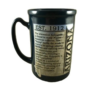 On the rear of the mug is the same "EST. 1912" and embossed "ARIZONA" to the right. Under "EST. 1912" is a paragraph describing what Kokopelli is.