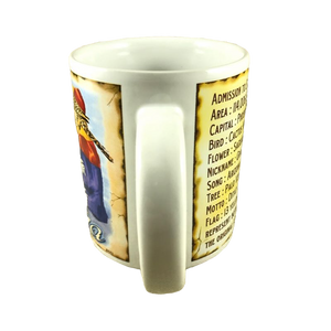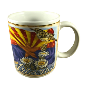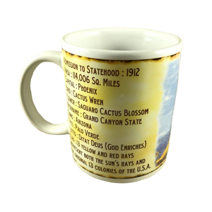 Artwork on one side depicts the flag of Arizona, flowers, and a bird. On the opposite side is assorted facts about Arizona.