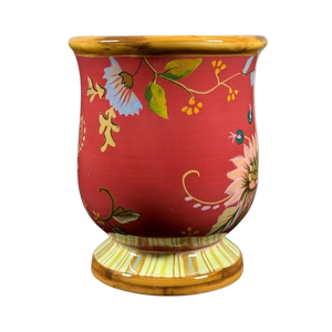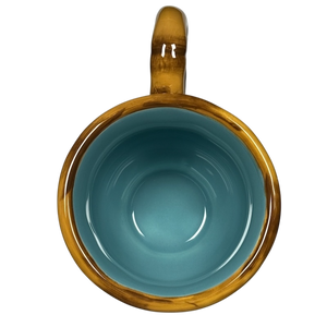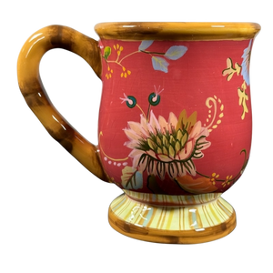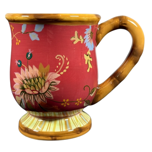 This is a pedestal mug with a gorgeous striped base and a bamboo styled handle.