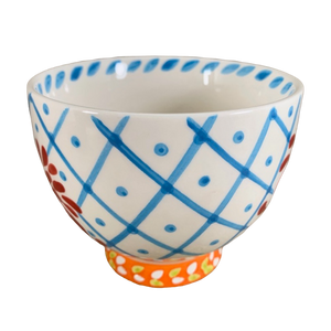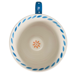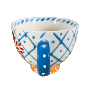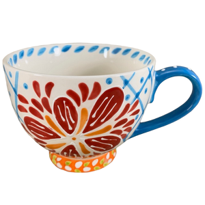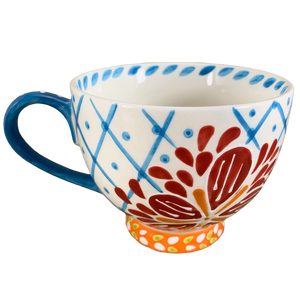 This mug features a very discrete pedestal (footed) base with an orange painted ring around the base with white and green leaf shaped objects.