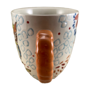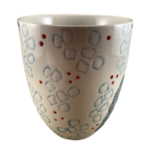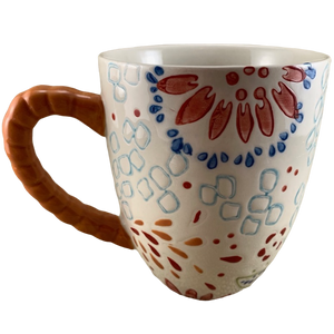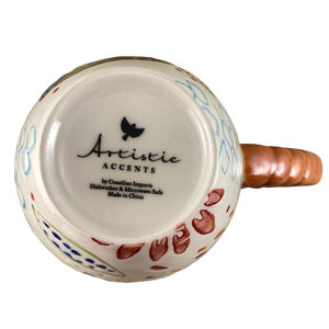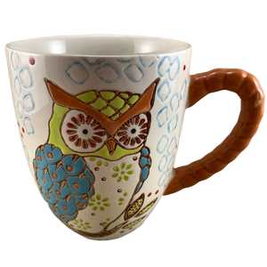 This is a beautiful mug with lightly embossed floral artwork wrapping around its exterior surface. On the front surface there is an embossed owl.