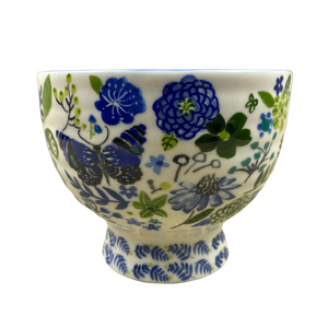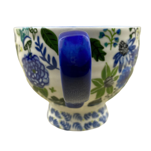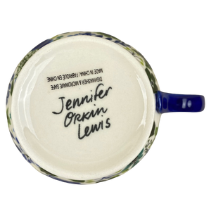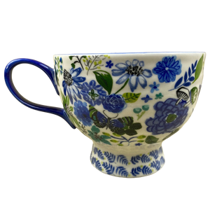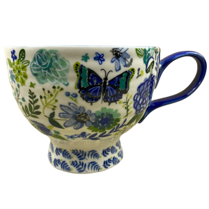 This is a stunning mug! It features beautiful floral and butterfly artwork wrapping around its exterior surface.