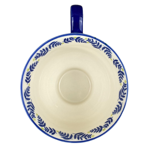 There is a leaf pattern wrapping around the base on the exterior and the same pattern is wrapping around the inner upper surface near the rim.