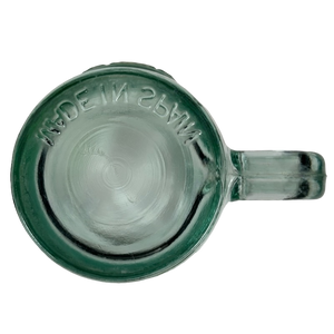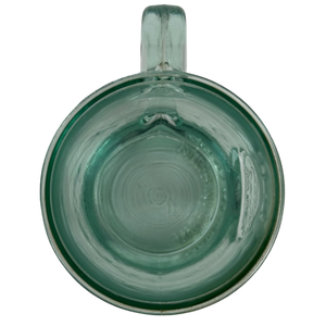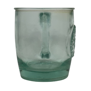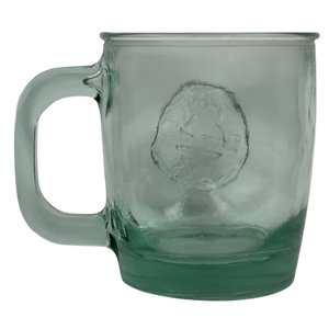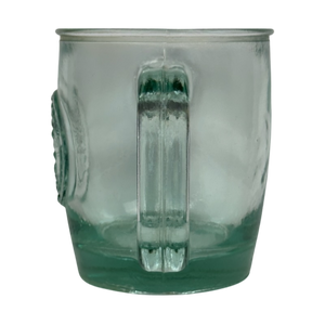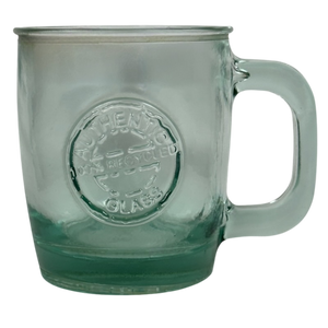 This is a green glass mug with "Authentic 100% Recycled Glass" embossed on the front surface.