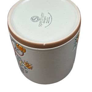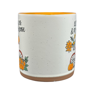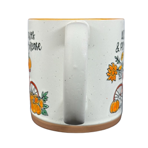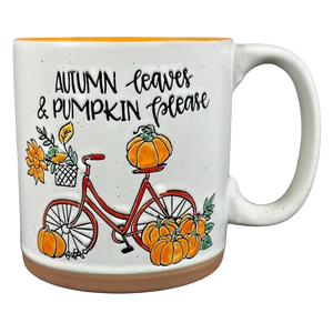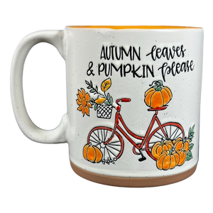 Features the same artwork lightly etched into its front and rear surface. Depicted is a bicycle with pumpkins on the seat, in the front basket, and next to the tires.