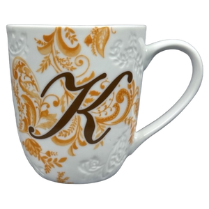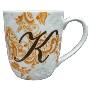 This beautiful mug features the letter "K" printed in brown in a cursive font on its front surface.