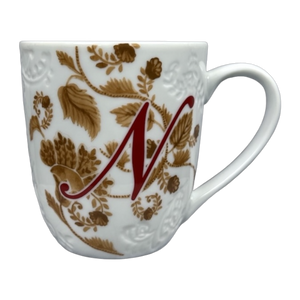This beautiful mug features the letter "N" printed in red in a cursive font on its front surface.