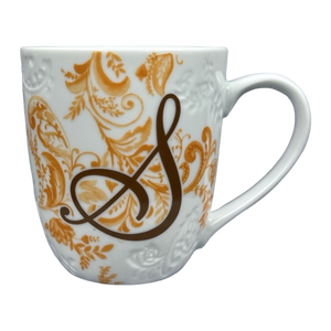 This beautiful mug features the letter "S" printed in brown in a cursive font on its front surface.
