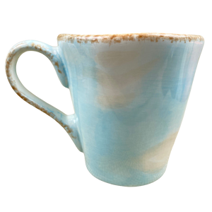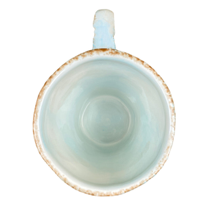 Features brown trim in a sponge like pattern on the rim and the sides of the handle.