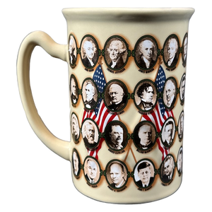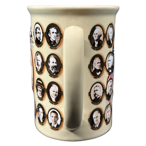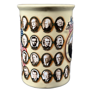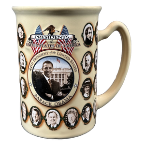 Wrapping around the entire mug are portraits which are not embossed of all 43 presidents prior to Barack Obama.
