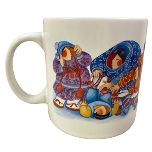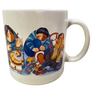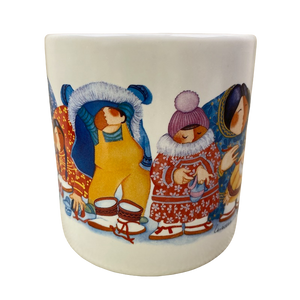 Features artwork wrapping around its exterior surface depicting Inuit women helping children to get dressed.
