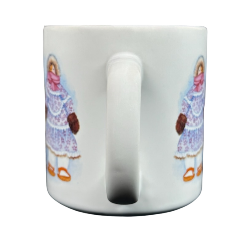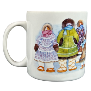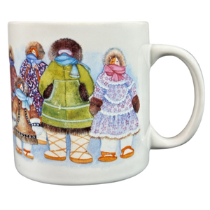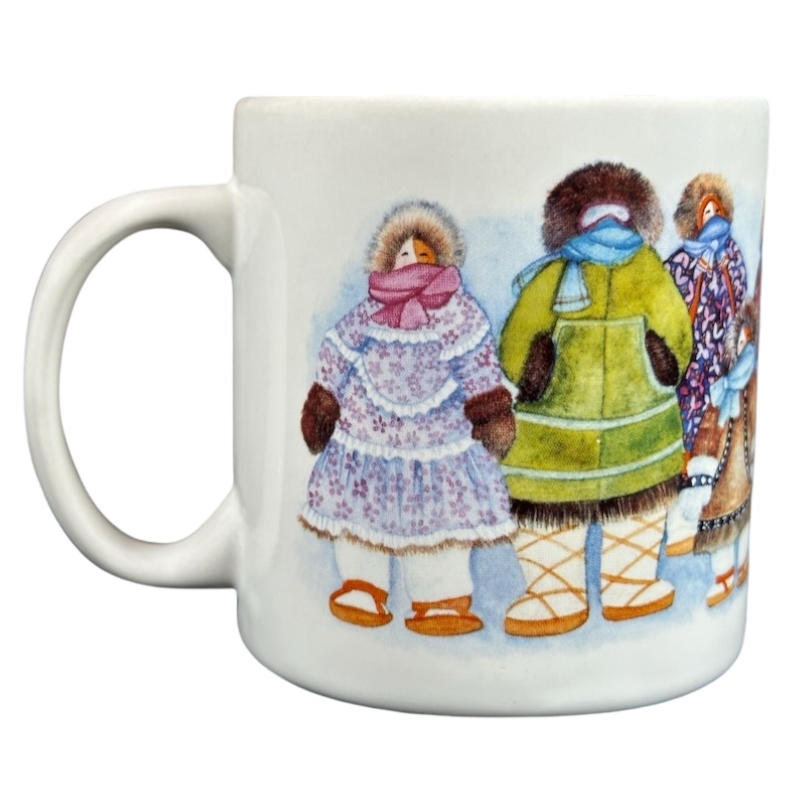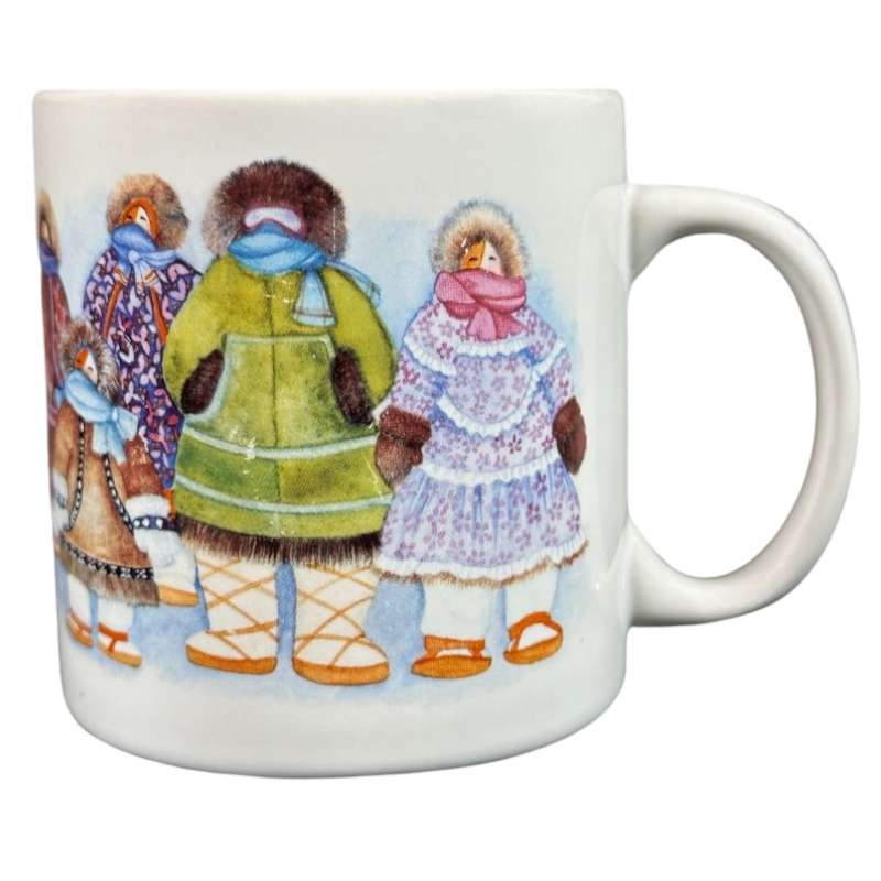 Features artwork wrapping around its exterior surface consisting of 10 eskimos wearing coats with scarves over their faces.