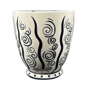 Artwork wrapping around its exterior surface features vertically placed thick black stripes alternating with columns of black swirls.
