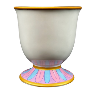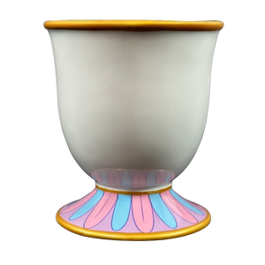 This mug features a pedestal style base with beautiful pink and blue petals on it and gold trim.