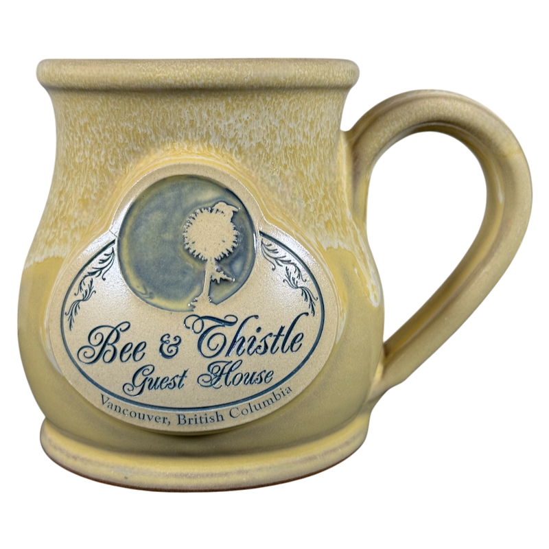 Features a raised plaque on its front surface with an image of a bee sitting atop a thistle flower.