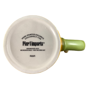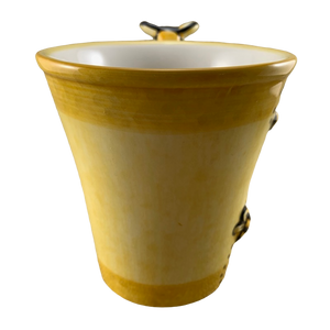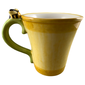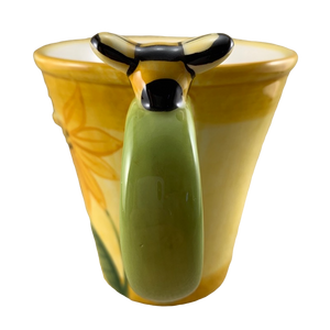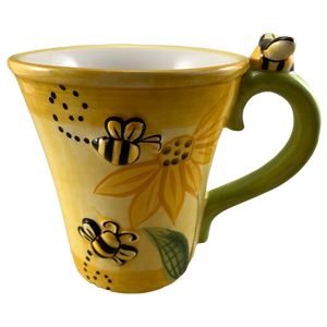 This beautiful mug features 2 embossed bees on its front surface and a sunflower drawn on the surface behind them.