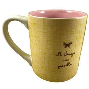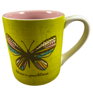 This beautiful mug features a colorful large butterfly on its front surface with "believe in possibilities" printed beneath it.