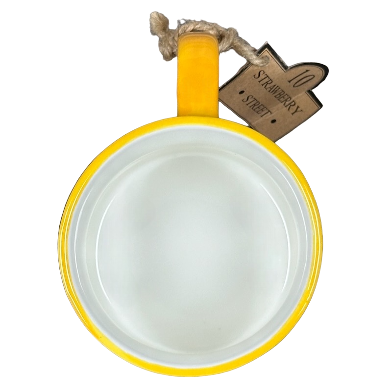 • This mug appears unused with its original sticker still on its bottom surface. and hang tag on the handle.